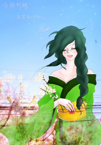 青空に駆ける五線譜と あはれ鳴き交わし鶯の夢 甘し冷たし春風は 明け染めの香を照らし給え 信楽イサゴさん宅より、お繁さんをお借りしました。背景写真は「写真屋水珠」さんよりお借りしています。 信楽さんが改名される前、ええと、去年の春くらい?に、 合格祈願を兼ねて描かせていただいたイラストです(・ω・*) お繁さんは桜とか梅とか、日本の春の花がとっても似合うと思うんだ! 桜と電線の写真、ということで、 もちろん、左手の先には、ささくれさんがいるのだと思います(笑)